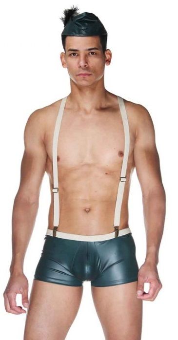 Костюм для мужчин, состоящий из трех предметов: трусов-боксеров, подтяжек и шапочки с перьями. Костюм из плотной гладкой ткани. Шапочка небольшая, также из плотной гладкой ткани, украшена перьями. В комплекте: трусы, подтяжки, шапочка.