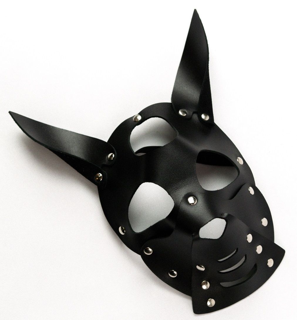 Маска Собака с ушками выполнена из натуральной кожи. Декорирована металлическими заклепками.