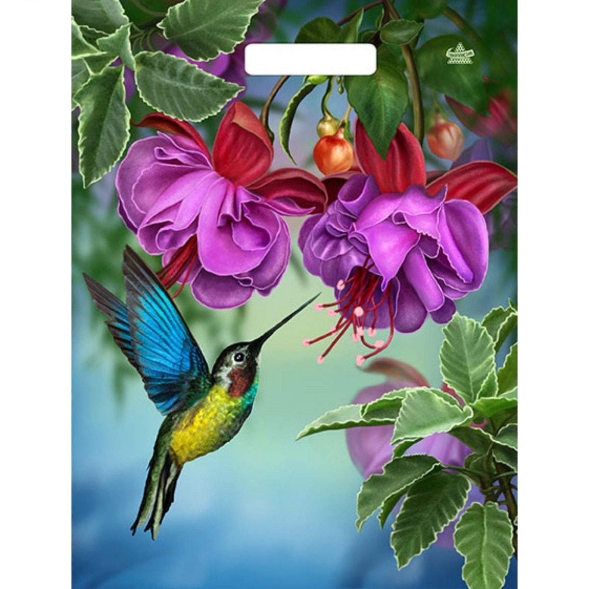 Пакет с принтом в виде колибри в цветах с вырубной ручкой (31х40 см).